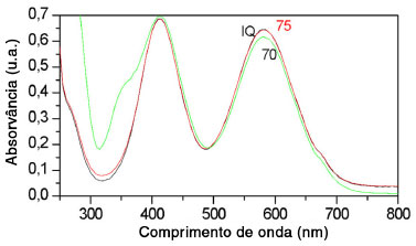 ![]() Figura 3. Espectros eletrônicos para as soluções álcool em gel IQ-UFBA, 70 e 75% (m/m) em álcool após reação com dicromato