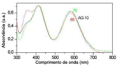 ![]() Figura 4. Espectros eletrônicos para as soluções álcool em gel AG-10, 65 e 70% (m/m) em álcool após reação com dicromato