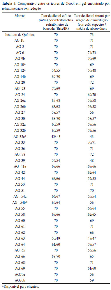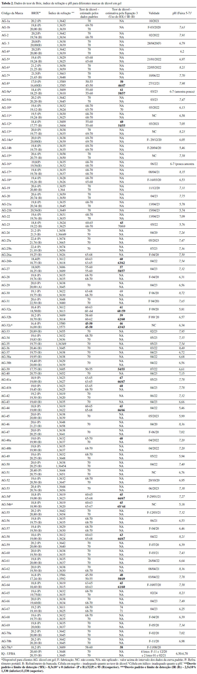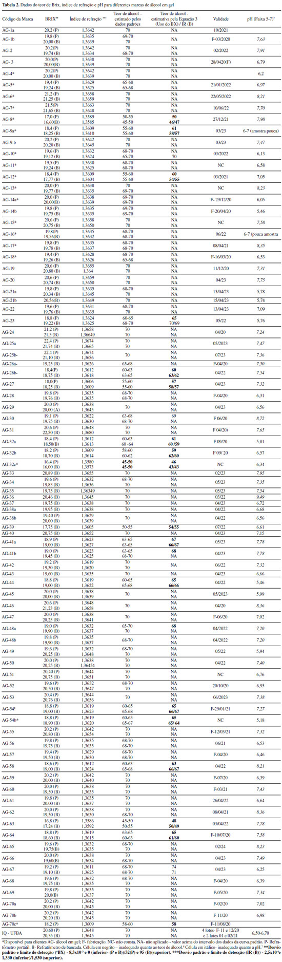 As duas metodologias aplicadas (refratometria e reação de oxirredução), indicaram que, das 70 marcas avaliadas, 19 delas (27,1%) apresentaram teores de álcool etílico, abaixo da faixa recomendada,9 portanto, não são efetivas para diminuir a transmissão do SARS-CoV-2.