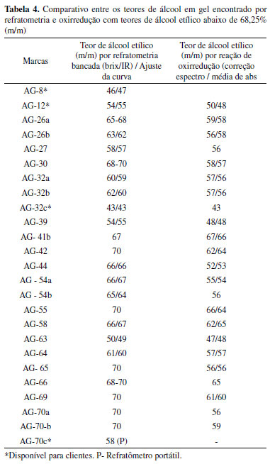 Das 36 marcas apresentadas na Tabela 3, para as quais foram aplicadas as 2 metodologias, a fim de determinar o teor de álcool etílico, os dados indicam que: i-17 marcas (47,22%) têm os valores similares e o teor de álcool etílico dentro do recomendado.9 ii- 11 marcas (30,55%,) apresentaram com a aplicação da refratometria um teor de álcool etílico inferior ao limite recomendado pelo Ministério da Sáude/ANVISA.9 Os valores (Tabela 3) abaixo do recomendado foram confirmados por meio da oxidação do álcool com o dicromato, embora com certa discrepância entre as duas metodologias. Com base nos dispostos acima (i e ii) é possível afirmar que 77,77% das marcas avaliadas apresentaram resultados confiáveis utilizando a refratometria. É importante destacar que a metodologia fornece uma informação rápida e se aplicada pela vigilância sanitária (Município e/ou Estado), com encaminhamentos aos órgãos competentes, sem dúvida, um menor número de produtos inadequados, para assepsia das mãos, seriam encontrados no mercado. Embora a refratometria tenha fornecido resultados confiáveis para 77,77% das marcas, nas situações cuja formulação possui concentração de emoliente acima do recomendado, os teores de álcool etílico não são garantidos. Na Tabela 3 há 8 marcas (22,22%) que resultaram produtos eficientes para assepsia das mãos, no entanto, a reação de oxirredução dicromato com álcool em gel, indicou teores de etanol aquém do recomendado.9 A Tabela 4 ilustra as marcas cujos teores de etanol encontrados por refratometria e ou oxirredução indicaram produtos não efetivos para assepsia das mãos em meio à pandemia. Essa tabela foi construída considerando as marcas com teores de álcool etílico abaixo de 68,25% (m/m), o valor mínimo recomendado na RDC no 422 de 16 de setembro de 2020.9