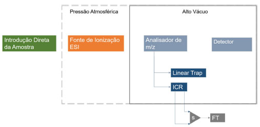 ![]() Figura 1. Esquema ilustrativo dos componentes básicos de um espectrômetro de massas, destacando a fonte de ionização electrospray ionization (ESI) e os analisadores de massas (LTQ e ICR) utilizados nesse artigo