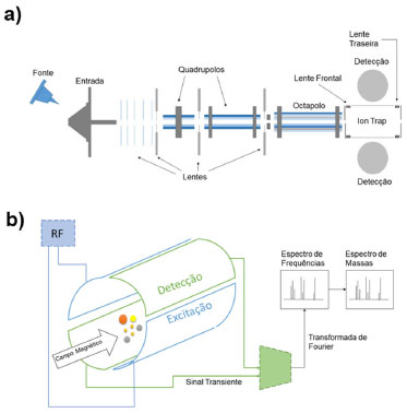 ![]() Figura 2. (a) Esquema geral do espectrômetro de massas Ion trap LTQ-XL, Thermo Scientific10 e (b) representação esquemática de uma cela de FT-ICR MS e do movimento ciclotrônico do íon e da excitação dos íons através do campo elétrico