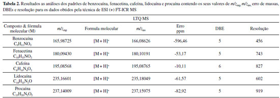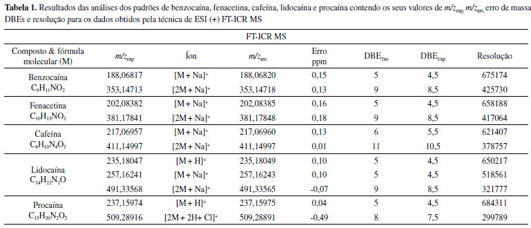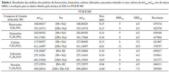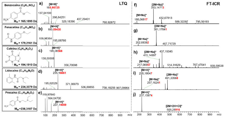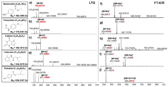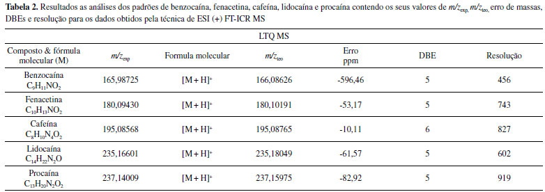 RESULTADOS E DISCUSSÃO Análise dos padrões de fármacos Os espectros de ESI(+)FT-ICR MS e ESI (+) LTQ MS possibilitaram a avaliação da exatidão de massas para o dois equipamentos. Observam-se na Figura 3a-e os espectros gerados no LTQ-MS, para os compostos benzocaina, fenacetina, cafeína, lidocaína e procaina que foram detectados como moléculas protonadas, [M+H]+, de m/z 166, 180, 195, 235 e 237 respectivamente. Já para o FT-ICR MS, a maior parte dos compostos (benzocaina, fenacetina, cafeína, lidocaína, Figura 3f-i, respectivamente) foi detectada na formas sodiada, [M+Na]+ (m/z 188,06817, 202,08382, 217,06957, e 257,16241) e [2M+Na]+ (m/z 353,14713, 381,17841, 411,14997 e 491,33568). Apenas as espécies lidocaina e procaina (Figura 3i-j) foram detectadas na forma protonada, [M+H]+, enquanto que a procaina foi a única espécie detectada na forma [2M+2H+Cl]+, produzindo o íon de m/z 509,2892. Ressalta-se no entanto que a formação das moléculas protonados, adutos sodiados e dímeros sodiados são formados durante o processo de ionização por electrospray (ESI),23,24 que diferenciou-se para cada equipamento devido a variações em suas formas de funcionamento.