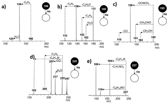 ![]() Figura 4. Espectros de ESI(+)MS/MS no LTQ MS para os padrões de (a) benzocaína, (b) fenacetina, (c) cafeína, (d) lidocaína e (e) procaína