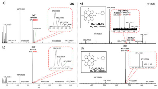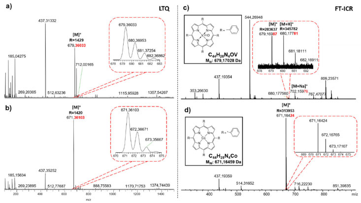 ![]() Figura 5. Espectros de ESI(+)LTQ-MS ((a) e (b)) e ESI(+)FT-ICR MS ((c) e (d)) para padrões de porfirinas de cobalto e vanadio