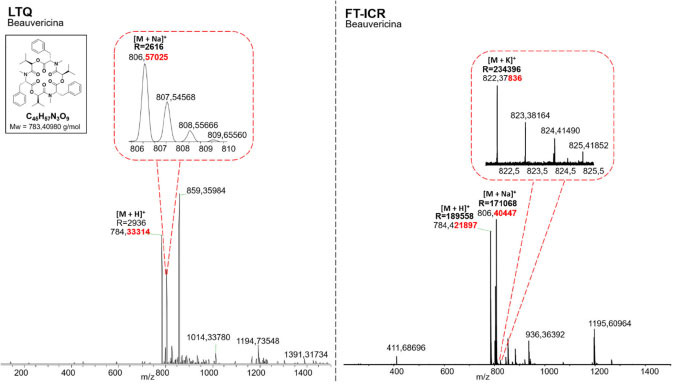 Ambos os complexos C44H28N4OV e C44H28N4Co foram detectados com uma resolução de massas na ordem de 103 e 106 para os analisadores LTQ e FT-ICR MS, respectivamente. Isso significa que apenas o FT-ICR MS é capaz de obter o seu perfil isotopólogo com alta resolução e exatidão de massas, distinguindo e fornecendo as fórmulas moleculares para as espécies, M, M+1 e M+2, e M+3, por exemplo. Isso é bem evidenciado ao analisar a expansão do sinal, magnificado na Figura 5 para o complexo C44H28N4Co. Beauvericina A beauverecina (BEA) é um hexa-depsipeptídeo cíclico que contém três resíduos em sequência alternada de D-hidroxi-isovaleril e N-metil-fenilalanil, com DBE igual a 19, descoberta pela primeira vez no fungo Beaveria bassiana e posteriormente encontrada em diversas outras espécies do fungo Fusarium spp.27,28 Moléculas de baixa massa molecular (considerando-se uma faixa de 200 a 1000 Da) e não voláteis, como BEA (783 Da), não desenvolvem múltiplas cargas durante sua ionização.27 Portanto, verifica-se na Figura 6 um comportamento monocarregado com formação de adutos em ambos instrumentos (típica distribuição isotópica do tipo M; M+1; M+2: e M+3). De acordo com Pócsfalvi e colaboradores,29 em análises por ESI(+) no modo positivo, a beauvericina pode facilmente formar adutos com moléculas e íons presentes na solução em que foi preparada e no tampão utilizado, principalmente potássio e sódio, devido à alta afinidade destes com a beauvericina. Foi possível identificar através da análise por FT ICR MS a formação dos adutos [M + H]+, m/z 784,42189, [M + Na]+, m/z 806,40447 e [M + K]+, m/z 822,37839 (com R 230 000,00 e erro < 7 ppm), o último sinal em menor intensidade. Um resultado similar é observado pela técnica de LTQ-MS, em que, apesar da baixa resolução (R= 2616 para m/z 806), é possível ainda fazer a distinção monoisotópica do seu sinal, como demonstrado na ampliação na região de m/z 806 a 810. Os dados obtidos nos experimentos anteriores estão sumarizados na Tabela 3.