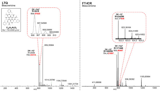 ![]() Figura 6. Espectros de massas adquirido para BEA através de ESI(+)LTQ-MS à esquerda e ESI(+)FT-ICR MS à direita