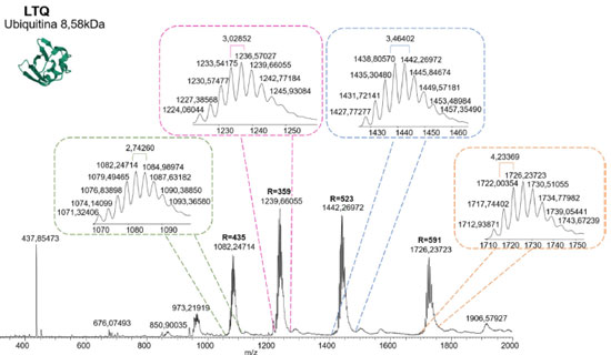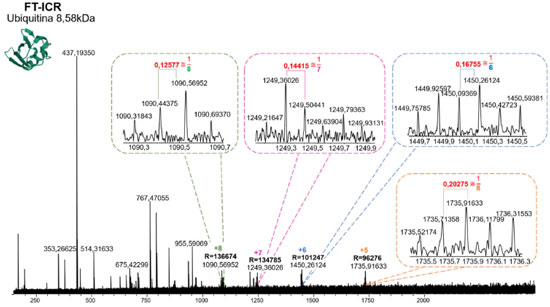 ![]() Figura 7. Espectro de massa adquirido para Ubiquitina através de ESI (+) FT-ICR-MS com ampliações para a determinação das cargas +5, +6, +7 e +8. Destaca-se em vermelho o resultado da separação isotópica equivalente a (1/zi) Da
