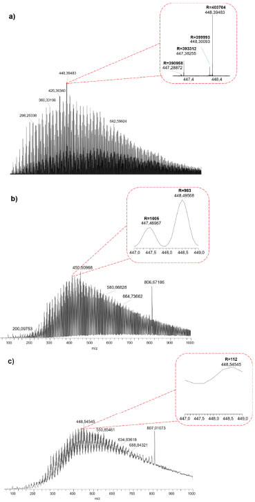 ![]() Figura 9. Espectros de (a) ESI(+)FT-ICR MS; e ESI (+) LTQ MS para o modo (b) normal e (c) turbo de aquisição de íons. A expansão na região m/z 447-449 enfatiza o número de sinais entre os analisadores de massas em uma faixa de 2 Da