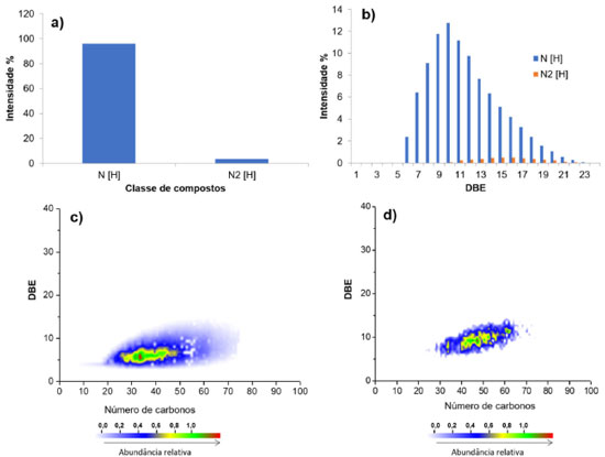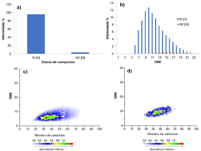 ![]() Figura 10. Distribuição de classe dos compostos (a) N[H] (b) N2[H]; e os gráficos de DBE versus número de carbonos para (c) classe N[H] (d) e N2[H], a partir dos dados de ESI (+) FT-ICR MS