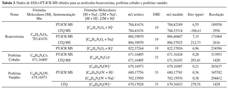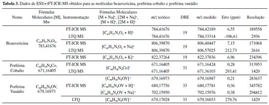 A benzocaina (m/z 166), Figura 4a, apresenta duas perdas neutras, a primeira de C2H4 levando a formação de m/z 138, e a segunda de H2O levando a formação do sinal em m/z 120. O espectro da fenacetina (m/z 180), Figura 4b, caracteríza-se pela perda de H2O levando a formação do fragmento m/z 162, e pela perda de C2H4 levando a formação do m/z 152. A perda de C2H2O foi a que levou a formação do sinal mais intenso (m/z 138) que por conseguinte, fragmentou-se perdendo C2H4 levando ao fragmento correspondente ao sinal m/z 110. O espectro da cafeína (m/z 195), Figura 4c, caracteriza-se pela perda de CH3OH levando a formação de m/z 163, e perda de CH3COH levando a formação de m/z 151. A perda de OCNCH3 foi a que levou a formação do sinal mais intenso (m/z 138) que fragmentou-se perdendo CO, levando ao fragmento correspondente ao sinal m/z 110. O espectro da lidocaina (m/z 235), Figura 4d, caracteriza-se pela perda de H2O levando à formação do fragmento m/z 217; perda de CO levando à formação do m/z 207; perda de C4H11N, formando m/z 205; perda de C2H4, levando à formação do fragmento m/z 162. Por último, o espectro da procaína (m/z 237), Figura 4e, resultou na em três perdas, a de C4H11N, C6H15NO e C7H7NO2, formando os fragmentos m/z 167, 119 e 100, respectivamente. Pode-se observar que esse experimento comprova os resultados obtidos na Figura 3a-e, em que essas estruturas são lábeis para se fragmentarem em um típico experimento de fullscan ou ESI(+)MS. Análise de porfirinas Na análise por ESI(+)MS dos dois padrões de porfirinas em ambos os equipamentos, é observado, nos espectros gerados no LTQ e no FT-ICR MS, a formação do sinal M+. Isso já foi observado em outros estudos,25 em que porfirinas metálicas divalentes são detectadas como M+. Isso é decorrente do fato da ionização das metaloporfirinas no modo positivo de ionização ser uma função direta de seus potenciais de oxidação.26 Na porfirina de cobalto, de M = C44H28N4Co e Mw = 671,164597 Da, foi possível identificar por meio da análise por ESI(+)LTQ a molécula como cátion M+ de m/z 671. Jà por ESI(+)FT-ICR MS observa-se o íon M+ de m/z 671,16424, fornecendo um erro de massas de 0,28 ppm. Também quando comparamos a resolução do sinal entre os equipamentos (FT-ICR MS e LTQ), os valores obtidos são de 313953 e 1420, respectivamente, para o íon de m/z 671. Para a porfirina de vanádio, M = C44H28N4OV e Mw = 679,170283 Da, os resultados de ESI(+)LTQ MS identificaram o complexo principalmente nas formas M+ (espécie mais abundante) e [M + Na]+ de m/z 679 e 702, respectivamente, enquanto o ESI(+)FT ICR MS detecta com alta resolução e exatidão de massas, o complexo, principalmente na forma [M + Na]+ de m/z 702,15976. Por FT-ICR MS foi possível identificar a molécula protonada [M + H]+ de m/z 680 com baixa intensidade e também a molécula sodiada [M + Na]+ de m/z 702 (Figura 5).