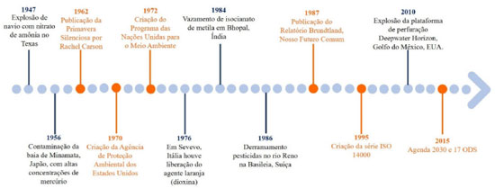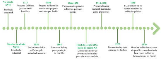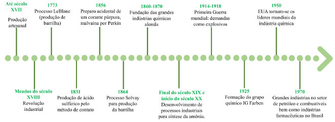 A produção industrial de H2SO4 também era uma necessidade evidente da época. Desde o século X já sabia como produzir tal ácido mas ainda precisava de um processo em larga escala. As câmaras de chumbo foram desenvolvidas para produzir este ácido, porém sua pureza não ultrapassava 78%. Assim, em 1831 foi desenvolvido o método de contato pelo britânico Peregrine Phillips sendo possível obter H2SO4 com maior pureza e sendo este um insumo fundamental para diversas indústrias químicas e de transformação.9 Em relação à química fina, temos o marco histórico dos trabalhos realizados por William Perkin que abriu caminho para produção de corantes e fármacos. Esse químico tentava sintetizar a quinina, um alcalóide com funções antitérmicas, antimaláricas e analgésicas, e obteve um corante púrpura, a malvaína.10 Dentre os anos de 1860-1870 as gigantes indústrias alemãs foram fundadas e destacaram o papel da ciência e da tecnologia para o mundo a partir do desenvolvimento de produtos químicos de interesse da sociedade, especialmente fármacos. Entre o final do século XIX e início do século XX destaque deve ser dado a todos os esforços para produção industrial de NH3. Grandes nomes como Wilhelm Ostwald, Carl Bosch, Henry Louis Le Chatelier, Fritz Haber, Hermann Walter Nernst, Robert Le Rossignol contribuíram para essa história de sucesso e produção em larga escala pela BASF® a partir de 1916.11 A primeira Guerra Mundial impulsionou a produção de certos produtos químicos, especialmente relacionados com os explosivos. A IG Farben, um conjunto das maiores companhias químicas, foi fundada em 1925 produziram tinturas e depois começaram a dedicar-se a outros setores mais avançados da indústria química. Contudo, em um dos episódios mais triste da história mundial esse conjunto de companhias foi responsável pela fabricação do produto usado nas câmaras de gás e culminou também na evasão de cientistas premiados para outros países.12 Em 1950 os Estados Unidos ganharam espaço no mercado mundial das indústrias químicas produzindo inúmeros produtos químicos e petroquímicos. E no Brasil, maior destaque se dá a partir da década de 1970 com a instalação de grandes indústrias farmacêuticas e pelo crescimento e incentivo ao setor de petróleo.13 A indústria química de modo geral teve uma postura reativa até meados dos anos de 1960. Essa abordagem se reflete nos acidentes que ocorreram ao longo da história conforme mostrado na Figura 2. Desses, podemos citar o ocorrido em 1947 nos Estados Unidos com a explosão de navio que carregava o produto químico NH4NO3 e o vazamento de mercúrio (na forma orgânica de CH3Hg+) e envenenamento da população na cidade de Minamata, Japão.14,15 Neste último caso de repercussão mundial, uma indústria lançava resíduos na baía de Minamata contendo esse composto desde os anos de 1930 e o primeiro caso resultado da intoxicação em humanos foi registrado em 1956.