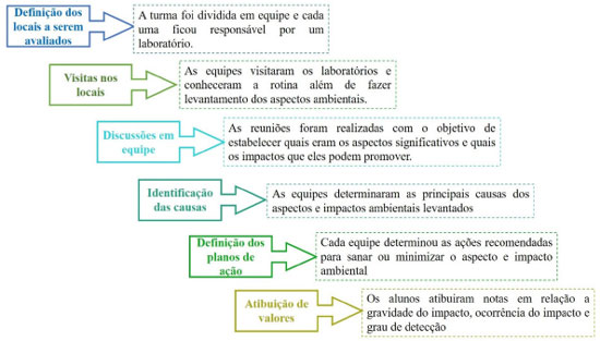As turmas dos anos citados foram divididas em equipes e cada uma avaliou uma indústria química, nacional ou multinacional, a partir da coleta de informação nos seus sites, especialmente nos relatórios de sustentabilidade, políticas ambientais entre outros documentos publicados por estas indústrias. Esses dados publicados de maneira clara e objetiva possibilitaram aos alunos conhecer a atuação das mesmas bem como suas políticas no que diz respeito as suas responsabilidades socioambientais. O tipo de auditoria nestes três anos relatados foi a auditoria de desempenho ambiental. Essa auditoria tem por objetivo a verificação detalhada do desempenho ambiental da organização em operação e normalmente é solicitada a cada requerimento ou renovação de licença ambiental.1 As equipes divididas tiveram que escolher as funções fictícias para: auditor líder (gerente), auditores e especialistas. Os itens necessários para realização da auditoria bem como da documentação a ser entregue para a professora foram: identificação, plano de auditoria, constatações da auditoria, propostas de melhorias e conclusões da auditoria. Além disso, os alunos tiveram que construir um questionário pré- auditoria e uma tabela com indicadores de desempenho ambiental (identificação dos aspectos ambientais e indicadores de desempenho). Ao final, cada equipe faz apresentação da auditoria e ocorre discussão sobre a atividade realizada e propostas de melhorias. Avaliação da gestão ambiental nos laboratórios de ensino Essa atividade se deu com 13 alunos matriculados na disciplina com duração da atividade de aproximadamente 2 meses no ano de 2018. Para tanto, a atividade tinha como objetivo avaliar como era o sistema de gestão ambiental nos laboratórios de ensino de Química da UEPG. Ao todo, foram avaliados 6 laboratórios, sendo eles: Química Geral e Inorgânica (QGI), Química Orgânica (QO), Química Analítica (QA), Bioquímica (BQ), Físico-Química (FQ) e Análise Instrumental (AI). Um dos grandes desafios para implementação de um sistema de gestão ambiental é o levantamento aspectos e impactos ambientais, bem como uma análise crítica dos mesmos. Para auxiliar nessa abordagem foi utilizado o método denominado Análise dos Modos de Falhas e seus Efeitos, FMEA (do inglês Failure Mode and Effect Analysis) adaptado.24,25 Essa metodologia tem ampla aceitação pelas organizações potencialmente poluidoras, uma vez que permite não somente fazer o levantamento dos dados mas também a aplicação de índices de criticidade e, assim, facilita a implementação das ações corretivas quando necessário. As etapas realizadas são sintetizadas na Figura 3.