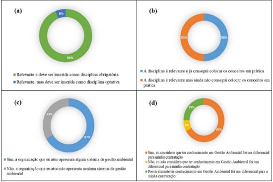 ![]() Figura 6. Resultados das avaliações para os egressos sobre: (a) opinião sobre o caráter da disciplina, (b) aplicação dos conceitos na sua rotina profissional, (c) a organização dos egressos que atuam na indústria ou laboratório de análises químicas apresenta ou não algum sistema de gestão e (d) opinião sobre o conhecimento em gestão ambiental como diferencial para contratação