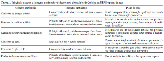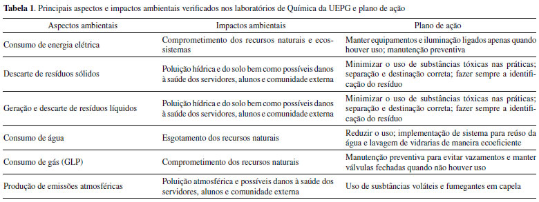 As habilidades de comunicação e trabalho em equipe são de grande importância para a formação de um Bacharel em Química e esta atividade promove o maior desenvolvimento das mesmas uma vez que o aluno precisa trabalhar com colegas escolhidos via sorteio e devem se comunicar entre o próprio grupo e para os demais colegas mostrando o desenvolvimento da sua função. O desenvolvimento do pensamento crítico é inerente à qualquer profissional e o que observa-se dos alunos é que eles conseguem visualizar possibilidades em termos de reúso de água, uso de energias renováveis, aproveitamento de resíduos para o desenvolvimento de novos produtos que podem ser usados na cadeia produtiva ou não. Essas habilidades são preconizadas nas Diretrizes Curriculares Nacionais para o curso de Bacharel em Química e podem ser contempladas em atividades e projetos que visem a aplicação dos conhecimentos de química e desenvolvimento de consciência e conceitos de gestão ambiental.27,28 A habilidade de liderança é necessária tanto para um químico que atue na indústria, laboratório químico como na academia. Essa habilidade normalmente não é contemplada de maneira clara e objetiva nas disciplinas de formação básica, justamente porque outras habilidades e conhecimentos precisam ser explorados nas mesmas. O que se observa nessa atividade que o aluno consegue de fato motivar a equipe e principalmente, inspirar os colegas para os resultados e ideias. Percebe-se, inclusive, que alunos que já tiveram experiência profissional conseguem ensinar os demais colegas e mostrar seus conhecimentos em prol do desenvolvimento da equipe. Esse tipo de treinamento é fundamental para preparar os alunos para futuras entrevistas de estágio e emprego bem como para a vida profissional, de fato. Por fim, a habilidade em destaque na atividade é a escrita, de maneira clara e objetiva, na linguagem técnica bem como organização e atualização de documentação. É inerente a qualquer curso de química a escrita de relatórios científicos e demais textos. Todavia, percebe-se que muitas vezes o aluno tem dificuldade de relacionar isso com as futuras atividades profissionais. Logo, trazer esse tipo de documentação fortalece a habilidade de escrita e ainda desperta ao aluno para as situações reais. A simulação de auditoria foi relatada por Olivares e colaboradores, onde os autores relatam uma experiência didática a respeito do Sistema de Gestão da Qualidade para Laboratório, segundo a norma NBR ISO/IEC 17025. O docente da discplina criou um ambiente fictício e o escopo era a auditoria em um laboratório de para análise de contaminantes em alimentos. Após a contextualização teórica sobre o assunto, os alunos foram divididos em grupos e os integrantes tinham suas responsabilidades atribuídas nas áreas técnicas, administrativas e de qualidade. Os alunos então realizaram uma simulação de auditoria criando na própria sala de aula um ambiente organizacional e destaca-se todos os alunos desempenharam o papel de auditor ou auditado. Em relação à percepção dos alunos, verificou-se que a atividade foi desafiadora e gerou expectiva. Ademais, a simulação de um ambiente real foi bem recebida pelos alunos e os autores reportam que esta atividade superou as expectativas e acreditam na importância da prática para a vida profissional dos alunos.29 Em relação à importância do tema, Monteiro e colaboradores apontaram o uso das auditorias ambientais compulsórias como ferramenta de avaliação do desempenho ambiental em uma indústria química situada no Sudeste do país. A partir da coleta de dados entre os anos 2011-2014, os autores verificaram que a auditoria ambiental compulsória é uma ferramenta de avaliação do desempenho ambiental que traz informações extremamente importantes sobre o desempenho ambiental da organização. Neste estudo de caso, a indústria química em questão projetava e fabricava equipamentos criogênicos. A partir dos dados de auditoria ambiental dos anos escolhidos, verificou-se que a organização conseguiu a redução no consumo de água e de energia, além da melhoria do grau de atendimento das condicionantes da licença ambiental. Assim, a auditoria ambiental possibilitou a melhora no sistema de gestão ambiental e nas conformidades legais bem como na relação com seus clientes.30 Segundo Vieira, a auditoria ambiental está se tornando uma ferramenta básica na avaliação da saúde ambiental de uma organização de qualquer porte e pode diagnosticar os riscos que podem se transformar em sérios passivos ambientais.31 Logo, a importância da auditoria ambiental é indiscutível, uma vez que as organizações estão cada vez mais preocupadas na melhoria contínua dos seus serviços e produtos mas também mostrar que apresentam a capacidade de colocar o meio ambiente como protagonista de suas ações. O aluno de química que tem conhecimento e participa de uma situação próxima da real neste tema apresentará então diferencial competitivo no mercado de trabalho. A gestão ambiental nos laboratórios de ensino de Química da UEPG Essa atividade didática teve como objetivo mobilizar os alunos para verificar os potenciais impactos ambientais das ações realizadas em laboratórios de química. Para tanto, escolheu-se realizar o estudo nos próprios laboratórios de ensino da Química uma vez que os alunos já estão familiarizados com a rotina dos mesmos e organização. Além disso, os alunos puderam ter mais contato com o gerenciamento dos resíduos gerados nas aulas experimentais e também fazer um levantamento dos principais aspectos e impactos ambientais das ações, conforme mostrado na Tabela 1.