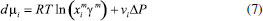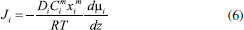 STEADY STATE MODELING Hypotheses The following premises were assumed to be true: The above assumptions are based on the work of Servel et al.6 and Schiffmann and Repke30 and did not significantly affect the results of the analysis. Mass balance The overall mass balance for a PV module, is: ![]() If the feed is known and the permeate is determined using the solution-diffusion model, the flowrate FF can be calculated. From the individual mass balance, mass composition of the retentate is calculated: ![]() The fraction of ethanol recovered in the PV corresponds to the ratio between the molar flow of ethanol in the retentate and in the feed. ![]() Energy balance From the energy balance: ![]() To solve the energy balance is considered that:6 Once flows and enthalpies are calculated, temperatures can be determined. Mass transfer The solution-diffusion model is the most widely used to describe permeation through membranes.31 The mechanism is divided into three stages: sorption; diffusion and desorption. According to the Fick's law, the steady state diffusive flow of component i (ethanol) through the membrane with l thickness is: ![]() where Dim is the diffusion coefficient of the membrane and Cim is the concentration of component i on the membrane surface. This study evaluated two approaches to determine the mass transfer. The first one uses the PERKAT model,32 which encompasses all parameters related to membrane morphology and interaction with solute in a single variable. The second approach uses the PERVAP model,33 which determines the diffusion coefficient through the theory of free volume and reduces the need for experimental information. The two models were developed based on Figure 1, which presents an illustrative scheme of the main parameters of mass transfer in a PV membrane. PERKAT model The permeate flow is related to the gradient of chemical potential: ![]() The chemical potential is a function of the composition inside the membrane and the pressure variation across it: ![]() Since Pm is the pressure at different points in membrane, a linear decay is assumed: ![]() To calculate the composition on the feed side of the membrane ( x i , F m ), it was considered the liquid phase in equilibrium. So, the chemical potential on fluid can be considered equal to the chemical potential on the membrane surface ( μ i , F = μ i , F m ). Thus, a relationship can be obtained between the feed composition and the activity coefficients of the pure component (γi) and the membrane (γm). The same considerations were made for the permeate side, assuming equilibrium in the vapor phase ( μ i , P = μ i , P m ). Finally, the permeate flow is: ![]() where the vapor fraction in the permeate stream (yi,P) must be collected from experiments, while the feed fraction is known. The term (DiCim/lγm) is known as a transport parameter, and includes the variables related to the morphological and kinetic characteristics related to the membrane permeability. This parameter was considered constant. Selectivity The separation factor, or selectivity, quantifies the ability to transport a particular specie: ![]() PERVAP model The PERVAP model expresses the chemical potential in terms of concentration and includes selectivity in Fick's Law. In this case, it is not necessary to use experimental data. In this model, the permeate flow is: ![]() where Dim is the diffusion coefficient, γm is the membrane activity coefficient, which is responsible for quantifying the affinity between the membrane with a certain component, and p = Pp/Pisat is the relative pressure on the permeate side. In this approach, Eq.(10) and (11) are solved simultaneously. The vapor and liquid phases were considered to be in equilibrium ( μ i , F = μ i , F m and μ i , P = μ i , P m ). Determination of the diffusion coefficient The diffusion coefficient calculates the dependence between temperature, concentration and molar mass in polymeric systems and measures the resistance to mass transfer of each component. This coefficient is calculated according to the free volume theory:34,35 ![]() where D0 is the pre-exponential factor; E is the critical energy needed for a diffusant to overcome neighboring attractive forces; γ is an overlap factor, accounting for the fact that more than one molecule may access the same free volume; V ^ i is the critical local hole free volume required for a diffusive jump of component i; ωi is the mass fraction of i; ξ is the constant that expresses the ratio between the molar volume of the solvent and polymer jump unit; K11 and K21 are free volume parameters for the solvent; K12 and K22 are the parameters for the polymer; φ1 is the volume fraction of the solvent; χ is the solvent/polymer binary iteration parameter; Tgi is the glass transition temperature of component i. Many published papers in the literature are based on this theory. Mafi et al.14 developed a hydrophobic pervaporation model for the removal of ethanol from aqueous solutions. The authors satisfactorily predicted permeate flows and selectivity and determined the effects of feed concentration and temperature on system performance. In this way, it was possible to determine the operating conditions. Darvishi et al.36 developed a predictive model for removing styrene from wastewater in petrochemicals. The authors compared the free volume theory by Vrentas and Duda,34,35 and another theory proposed by Fujita.37 After verification with experimental data, the theory of Vrentas and Duda,34,35 presented higher representativeness of the results. However, the authors concluded that accuracy of both methodologies decreases with the increasing in feed concentration. Model parameters The ethanol/water chemical system has polar components, no electrolytes, with an operating pressure less than 10 bar. For this reason, the Nonrandom Two-Liquid (NRTL) thermodynamic model is indicated to calculate the activity coefficients.38 The vapor pressure and molar volume of compone