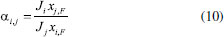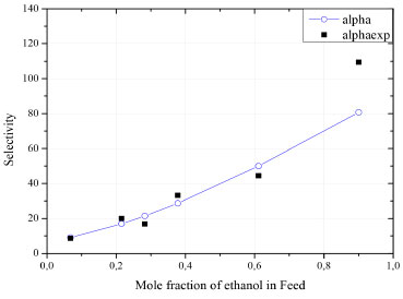 The water flow in the permeate is always preponderant to that of ethanol flow, as the membrane is hydrophilic (selective to water). On the other hand, when the composition approaches the azeotropic point, the difference between flows is substantially reduced. This behavior suggests the occurrence of coupled transport of both components, caused by strong interactions with the membrane. As observed by Valentinyi et al.,43 there is a strong coupling between the organic and water flows. As the PERVAP model presented the best fit to the experimental data, it was assumed that it describes the real behavior of the process. In this case, PERVAP will be used for subsequent analyzes. Selectivity The solution-diffusion model indicates that selectivity during pervaporation is governed by the sorption and diffusion rates of the elements of the mixture.29 Therefore, the selectivity of water over ethanol () measures how much difficulty is the permeation of ethanol in relation to water. According to Figure 6, the increasing of ethanol composition in feed stream is directly proportional to the separation factor, presenting an almost linear behavior.