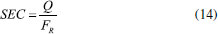 The calculated cross-sectional areas for modules PV1, PV2, PV3 and PV4 were 1.097 m2, 1.331 m2, 1.845 m2 and 2.625 m2, respectively. The inclusion of a new module in process results in an increasing in ethanol composition of the output, which justifies the progressive increasing in the area of module. As noted earlier, the increasing in ethanol composition in feed possibly favors the occurrence of coupled transport of the undesired component; on the other hand, the total permeate flow per square meter of membrane decreases. The decreasing in flow reduces the amount of lost latent heat, which results in a usage of a larger membrane area for a fixed amount of heat (ΔT = 20 °C). According to Table 5, the feed flow decreases along the modules. This decrease favors obtaining a product with high purity. The fraction of ethanol recovered by streams 3, 6, 9 and 12 is 99.60%, 99.49%, 99.27% and 98.90% respectively. Once again, the reduction in flow affects the percentage of ethanol recovered. The fraction recovered from the overall process was 97.29%. Specific energy consumption In case of cascade PV, considering a feed of 1886 kg/h, 37.05 kmol/h of ethanol at 99.97% molar were produced. The total energy consumption was 194.197 kWh. Table 6 compares the SEC obtained by the cascade pervaporation unit (PVC) to conventional (CS) and thermally coupled (TCS) extractive distillation,42 and to extractive distillation with (CS+) and without thermal integration (CS-), and thermally coupled with (TCS+) and without (TCS-) thermal integration.41