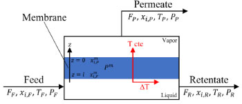 Universidade Federal de Campina Grande, 58429-900 Campina Grande - PB, Brasil Recebido em: 02/09/2021 *e-mail: karoline.dantas@ufcg.edu.br Pervaporation requires operation at mild temperatures and provides low energy consumption, which makes this technology economically attractive. However, pervaporation is not yet a widespread process in the industry. One of the justifications is the complexity in the quantification of variables related to the membrane in the most diverse conditions. This factor results in the absence of generic models in the simulation software. This work aims at the rigorous phenomenological modeling of a pervaporation process using a polyetherimide membrane intended for the dehydration of ethanol. The model was developed on the Aspen Custom ModelerTM platform. Two approaches were implemented and compared: PERKAT and PERVAP models, being the last one the best model. The main variables of the process were evaluated. It was possible to verify the capacity of separation of the pervaporation module in breaking the barriers of the azeotrope, reaching a product with a high level of purity in ethanol, and recovery of up to 99.8%. In addition, the generic PERVAP model was exported to Aspen PlusTM and a cascade pervaporation unit was simulated. The specific energy consumption was calculated and compared to that of traditional separation processes. A 70% reduction was obtained compared to the most economical distillation configuration. INTRODUCTION The ethanol/water mixture forms a minimum boiling azeotrope with 95.6 by mass% of ethanol. Currently, the most used processes to separate this mixture are extractive and azeotropic distillations. However, both require high-energy consumption and azeotropic distillation uses solvents with a high level of toxicity. In this sense, pervaporation appears as a technology to overcome these disadvantages. Kober1 was the first one to use the term "pervaporation". For decades, it was considered merely a laboratory technique due to its low selectivity, low permeate flow and high cost. A few years later, the asymmetric membranes developed by Loeb and Sourirajan2 obtained a promising product flow, which stimulated developments in the area. Only in 1983, GFT Membrane Systems built the first pilot-scale unit for ethanol production.3 In 1988, GTF also designed the first industrial-scale plant in France.4 Pervaporation (PV) is a separation consisted by the partial vaporization of a liquid mixture through a membrane.5 It is mainly used to separate mixtures with special thermodynamic characteristics, such as mixtures that present azeotrope or pinch point.6 The membrane is a physical barrier that separates the feed into permeate and retentate streams. The driving force is the gradient in chemical potential, corresponding to the concentration difference between the two sides of a membrane.3 Figure 1 illustrates a simplified PV module. The feed corresponds to a liquid solution at low temperature and atmospheric pressure. The permeate is constituted by the fraction of permeate flux that is vaporized, which is immediately removed from the module by vacuum or entrained gas. The permeate flux is rich in the component with the highest degree of affinity with membrane. The retentate flux is concentrated in the compounds with less affinity with membrane. The temperature of the retentate is lower than the feed temperature. This decrease occurs because of the permeate evaporation, which loses latent heat. This reducing in temperature limits the size of PV module.