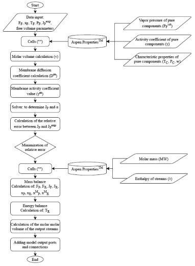 The specific free volume (V^i) was estimated using atomic constants according to Sugden.39 The binary iteration parameter (χ) was calculated using the Lee and Danner group contribution method. Data of the free volume parameters for the polymer were extracted from literature,40 and are a function of the viscosity and temperature of the pure polymer. Infinite dilution was assumed for both components. For the PERVAP model, it is necessary to specify the membrane thickness (l) equal to 160 µm.29 Numerical solution and optimization The algorithm for the solution of all equations was developed in Aspen Custom Modeler and is shown in Figure 2. The system of non-linear equations was solved using the Newton Mixed method. This algorithm uses the pure Newton method in the initialization and steady state steps and Fast Newton in the dynamic steps.