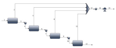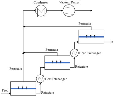 The transport parameter (related to the PERKAT model), and the membrane activity coefficient (related to the PERVAP model) were determined by minimizing the relative error (Eq. (13)) between the experimental data and those obtained by the respective models for the permeate flow: ![]() The minimum of each objective function was determined using the Nelder-Mead method (Simplex). Aspen PlusTM simulation A cascaded PV unit consists of a sequence of PV modules in series, interspersed by heat exchangers. In order to condense the permeate stream, a heat exchanger and a vacuum pump are required, as shown in Figure 3. Aspen PlusTM was used to model this process. The auxiliary equipment was modeled using the simulator library. Only the membrane was represented by the model developed in the Aspen Custom ModelerTM. In this case, the model that obtained the best results was generalized and exported to Aspen PlusTM.