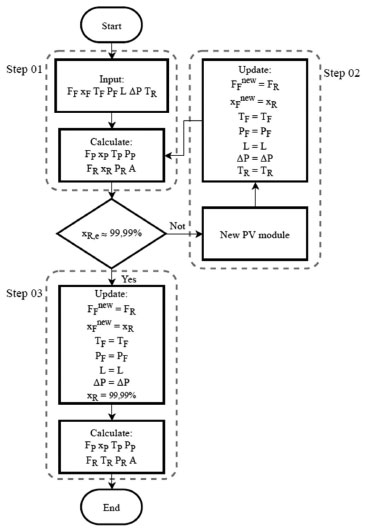 The temperature of the retentate (TR) is determined based on the consideration made by Servel et al.6 A temperature difference between the feed and product stream of 20 °C was assumed (ΔT = TF - TR), in order to achieve a minimum permeation rate in each PV module. The configuration of PV cascade was developed to optimize the relation between the area and energy consumption of the membrane. To obtain the optimum configuration of the cascade PV process, the number of modules was calculated though the algorithm presented in Figure 4. This procedure was done just using Excel calculations.