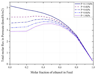 Figure 5 and Figure 6 indicates that the increasing of ethanol molar fraction in feed stream causes a considerable reduction in water flow on permeate stream, while the ethanol flow slightly increases. This behavior is a consequence of the increasing in membrane selectivity for ethanol. In this regard: (1) at low and moderate concentrations of ethanol, water molecules have higher mobility within the membrane, due to their smaller molecular size; (2) high concentrations shift the concentration gradient, which impacts the activity coefficient and favors the permeation of the undesired component. It is important to highlight that, even so, the membrane remains preferentially selective to water in the entire concentration range. Influence of pressure on the permeate side The solution-diffusion model indicates that the pressure reduction on the permeate side favors diffusion through the membrane. This behavior is explained by the formation of a concentration gradient between the sides, which results in the shift of the chemical potential (the driving force of the process). A sensitivity analysis of pressure was carried out to verify this effect, as shown in Figure 7.