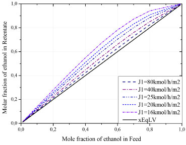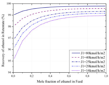 Figure 8 can also be interpreted as an x-y diagram, where the black line indicates the equilibrium composition. In this system there is no limitation in the separation along the entire feed range. In conventional distillations, a binary azeotrope is formed, around 89 mol% of ethanol. Figure 9 shows the ethanol recovery in the retentate stream when the feed flow is varied. In case of lower ethanol concentrations in feed, the membrane presents lower efficiency for ethanol recovery. This recovery can be improved by increasing the initial flow. It is important to highlight that the recovered fraction, even in the weakest performance, is higher than 93%. For high concentrations of ethanol in feed, this value can be between 98.9 and 99.8% (molar).