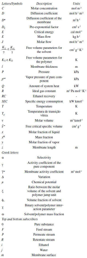 CONCLUSIONS The phenomenological modeling of the pervaporation process, using a polyetherimide membrane to separate the azeotropic ethanol/water mixture, was implemented in the Aspen Custom ModelerTM software. Two approaches were investigated: PERKAT and PERVAP. The models were compared with data from the literature, and PERVAP resulted in the highest representativeness. These results confirm the importance of including the variables that correlate the morphological characteristics of the membrane in the modeling of the process. It was found that the increase in the concentration of ethanol in the feed promotes the occurrence of coupled transport of the undesired component through the membrane, affecting the permeation of water. The pressure reduction on the permeate side favors the diffusion phenomena, due to the intensification of chemical potential gradient between the faces of the membrane. However, it has a predominant effect on ethanol concentrations below 60% in the feed. On the other hand, for pressures above 0.4kPa, a minimum concentration gradient is necessary to promote the increasing in permeation. Pervaporation avoided the azeotrope formation, making it possible to achieve high purity content. Increasing the feed flow with constant composition results in a less concentrated product. On the other hand, it favors the recovery rate of ethanol, which varied between 93.0 and 99.8% on a molar basis. The simulation of complete cascading pervaporation unit shows that the increase in the cross-sectional area of the membrane for each module added to the system is related to the increase in feed composition, which reduces the permeation rate per square meter of membrane. It was also found that the reduction of the total feed flow in each module favors the obtaining of a product with high purity, although the fraction of ethanol recovered is reduced throughout the modules. The specific energy consumption of the PVC configuration was the lowest when compared with other distillation processes and also with single PV modules.