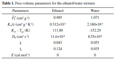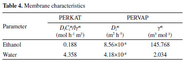 RESULTS AND DISCUSSION Model validation The key parameters for the characterization of the membrane are responsible for the way that diffusion of each component will occur. The transport parameter (DiCim/lγm) and the membrane activity coefficient (γm) refer to the PERKAT model and PERVAP, respectively. These parameters were determined through the optimization between the results of each model and the experimental data. Table 4 presents the obtained results, as well as the values of the diffusion coefficient used in the PERVAP model.