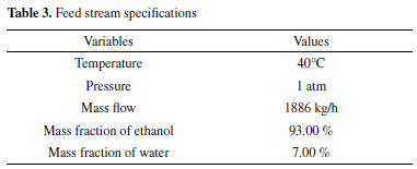 In order to compare the developed model with other processes for obtaining anhydrous ethanol, flow and composition information for the inlet stream were collected from the study by Brito et al..41 For membrane operation, temperature and pressure data were based on Qariouh et al..29 All the required information is shown in Table 3. The ethanol specification in product stream is 99.99 wt %.