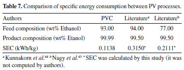 The PVC configuration presented the lower SEC; heat should be supplied to the replacement of the lost latent heat, due evaporation of the permeate amount. In mass basis, SEC of PVC is equal to 0.1138 kWh/kg. This value is compared with PV process from literature (ethanol/water system), as shown in Table 7.