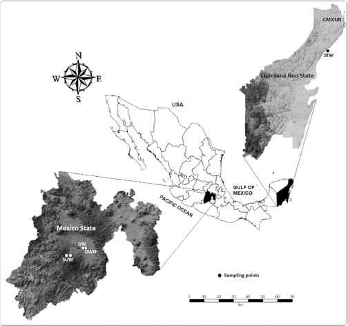EXPERIMENTAL Materials, reagents and certified reference materials All class-A certified volumetric flasks that were used in the preparation were of borosilicate glass, blue graduated, with polypropylene stoppers. They were decontaminated with 10% HNO3 v/v for 24 h and rinsed with high-purity water. The solutions were prepared using analytical-grade reagents from Merck (Germany). Deionized Milli-Q water (Resistivity 18.2 MΩ cm) was obtained from a Milli-Q® Reference (Millipore México). Nitric acid was purified by distillation in a Milestone Duopur (Milestone s.r.l., Italy) sub-boiling system to obtain the hyperpure nitric acid to use during the study. Certified Ar gas (99.999%) was supplied by INFRA, S.A. de C.V. México. A multi-elemental reference solution in 2% HNO3 was used at the National Laboratory of Nuclear Forensic Investigations in the National Institute of Nuclear Research. Sample collection and preparing The collection of all water samples was carried out according to Norma Oficial Mexicana-014-SSA1-1993.30 Ten samples were collected, from each point. For this study, we distinguish among three different types of samples: drinking water (DW, DWO), superficial water/groundwater from springs (SUW), and seawater (SEW). The exact locations and sample types are shown in Figure 1.