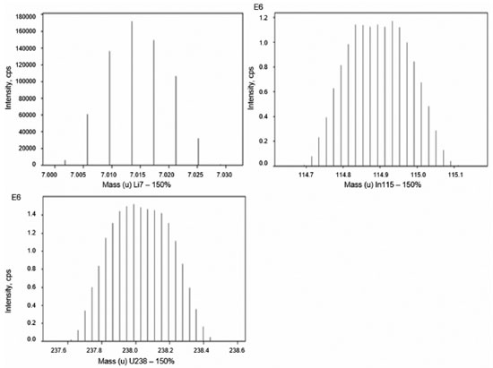 RESULTS AND DISCUSSION Optimization to isotopes measured To tune the system on the selected isotopes ( 7Li, 115In, and 238U), a multi-element solution with the elements Li, B, Na, Sc, Co, Fe, Zn, Y, Rh, In, Ba, Lu, Tl, and U at 1 µg L-1 (Merck Tune solution) was introduced. The Low Resolution mode was suitable for measuring isotopes such as Pb, Ra, Th and U because these radionuclides have low interferences with other elements. For this reason, the measurements were made only in Low Resolution mode and it was not necessary to tune in Medium Resolution and High Resolution, Figure 2.