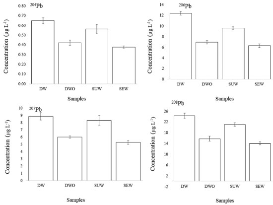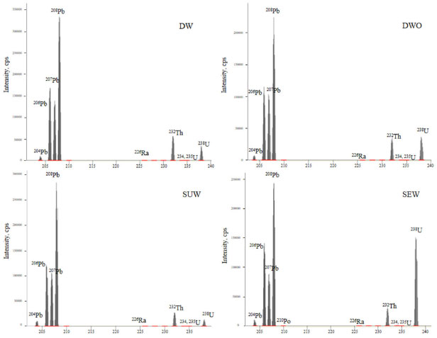 For the samples analysed, it can be seen that lead is the major element, followed by uranium in the SEW. Generally, uranium and thorium vary little among the other types of water: DW, DWO, and SUW. Isotope quantitative determination Lead: Pb, is one of the most widely studied metals in environmental sciences due to its toxicity and widespread use.35,36 The four lead isotopes ( 204Pb, 206Pb, 207Pb and 208Pb) have been present since the formation of the earth, so their isotopic composition in a given region and at a given moment depends on the concentration of lead at that time and the amount of lead that has been produced as a result of the radioactive decay of primordial 238U and 232Th radionuclides. These primordial radionuclides include isotopes of thorium, radium, polonium, lead, etc.15,17,35-38 Theoretically, it is also possible to determine the low-abundance isotope 204Pb on an inductively coupled plasma - sector field mass spectrometry.35 With respect to the concentration of lead isotopes, Figure 4, it can be seen that lead is present up to ~ 9.65-15.19 µg L-1 for 204Pb, ~6.29 12.39 µg L-1 for 206Pb ~5.27-8.87 µg L-1 for 207Pb and ~14.07-24.28 µg L-1 for 208Pb.