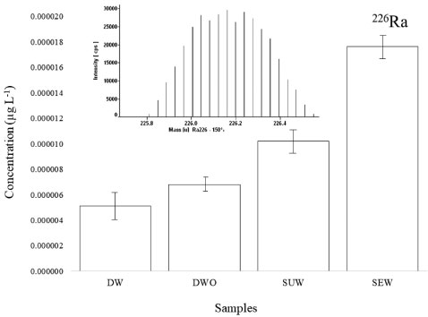 Radium: Ra, the radium qualitative and quantitative determination was done. The first goal was qualitative detecting the radio signal at the m/z=226 in the mass spectrum of ICP-SFMS, which was achieved. In this case, the radium peak shape was satisfactory in the spectrum displayed and the signals obtained in counting mode was displayed in colour blue. The 226Ra isotope was the dominant radium form. In the case of 226Ra, the concentration ranged from 0.000125 µg L-1 to 0.00045 µg L-1, Figure 5.
