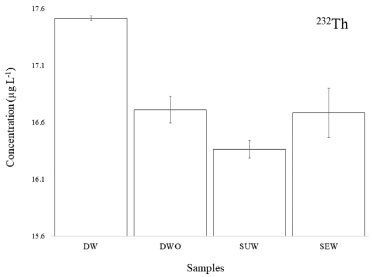 Thorium: Th, in the case of thorium isotope in water, 232Th was the dominant form in all water samples, Figure 6. Its concentration ranged from ~16.36-17.51 µg L-1 for 232Th.