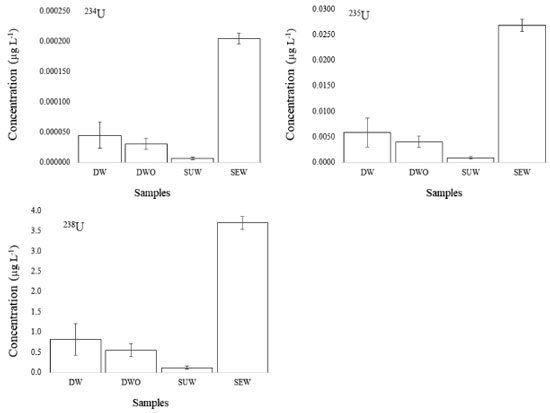 Uranium: U, Figure 7 shows the uranium isotopes found in water samples. Their concentration ranges are as follows: for 234U ~0.000007-0.00021 µg L-1, for 235U ~0.0009-0.0268 µg L-1 and for 238U ~0.1244-3.6974 µg L-1. It can see concordance with its natural abundance of them.34 We determined total U, then the slopes of the curves varied with the isotopic abundance of each isotope. For a given concentration of U the count rate at 238 was much higher than 234 or 235.