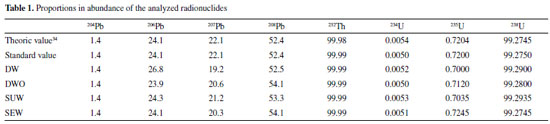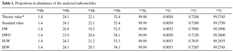 CONCLUSIONS Natural radionuclides (uranium, thorium and radium isotopes) and stable lead were measured in water samples from Mexico using a refined detection technique, in simultaneous mode, with short analysis times and ultra-trace levels of concentration and without previous chemical separations. 238U and 232Th were the dominant isotopes in all water samples. High uranium presence was found in seawater, while the highest concentration of thorium was found in drinking water. The presence of natural radionuclides (gross alpha emitters) in water according to their percentage decreased in the order of U > Th > Ra for seawater and the order Th > U > Ra for drinking water. According to the natural abundance, it can be seen that the radionuclides analyzed in the water reach values very close to the theoretical values, which supports that the analysis was correctly carried out and the values of the concentration of reliable isotopes. Sector field inductively coupled plasma - mass spectrometry is one of the most efficient techniques for the analysis of selected radionuclides at ultra-trace levels. Accreditation is now widely used to attest for laboratory competence; Laboratorio Nacional de Investigaciones en Forense Nuclear, which includes inductively coupled plasma - sector field mass spectrometry, has this accreditation. There is no potential risk to human health in the region of our country where the study was conducted. This is because drinking water for seawater is considered safe due to low concentration levels of radionuclides in the samples analyzed. Therefore, it should not be a cause for concern with respect to its consumption and marine life.