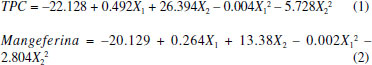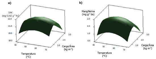 ![]() Figura 1. Gráficos de superficie de respuesta que muestran el efecto de la temperatura de deshidratación y relación carga área sobre: a) TPC y b) concentración de mangiferina