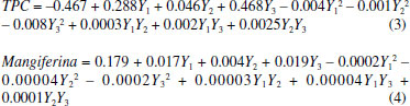 Optimización del proceso de extracción Una vez optimizado el proceso de deshidratación, se procedió a definir las condiciones de extracción, que nos permitan maximizar la cantidad de compuestos fenólicos extraídos. Como variables independientes se seleccionaron el solvente de extracción (Y1), tiempo (Y2) y temperatura (Y3). De igual manera, el TPC y concentración de mangiferina fueron las variables respuesta. Los rangos evaluados se seleccionaron en base resultados previos. Ahora bien, los solventes de extracción se eligieron en función de su seguridad, costo y disponibilidad. En este caso, se utilizó solventes GRAS (generalmente reconocidos como seguros) como el etanol y el agua. Solventes compatibles con la industria alimenticia. Respecto a la temperatura, el valor superior (60 °C) estuvo limitado por la capacidad del equipo de ultrasonidos. Además, Chen, Zhao y Yu32 señalaron que temperaturas superiores a 65 °C, provocan una degradación de los compuestos bioactivos. Finalmente, el tiempo de extracción máximo fue de 120 min, debido a que periodos más prolongados involucran un aumento en los costos de energía y operativos del proceso.33 Los resultados alcanzados se muestran en la Tabla 2. Como se puede observar el contenido de fenoles totales varió desde 2.3 hasta 20.0 mg EAG g-1 bs de piel de mango deshidratada, mientras que la concentración de mangiferina varió desde 0.40 hasta 1.20 mg g-1 bs. Nuevamente, los valores más elevados para las variables analizadas se observaron cerca del punto central del diseño experimental, es decir 50% EtOH, 62.5 min y 42.5 °C. La importancia estadística de los factores utilizados se estimó mediante un análisis de varianza (Tabla 2S, Materias Suplementario), encontrando que todos los términos presentaron efecto para el TPC y/o concentración de mangiferina. Se obtuvieron modelos matemáticos cuadráticos completos con un excelente ajuste (p > 0.15). Además, los coeficientes de determinación indicaron que más del 98% de las variaciones de las variables están explicadas por el modelo. Las Ecuaciones 3 y 4 se utilizaron para predecir el TPC y mangiferina, respectivamente. ![]() Por otro lado, para evaluar las interacciones entre los diferentes factores estudiados sobre las variables respuesta (fenoles totales y mangiferina), se construyeron las gráficas tridimensionales de superficie correspondientes (Figura 3). Respecto a la interacción solvente y tiempo de extracción, existe un incremento en ambas variables respuesta conforme la concentración de etanol y tiempo de extracción se acercan a 55% EtOH y 80 min. Sin embargo, al superar estos valores se produce una disminución en las variables de estudio (Figuras 3 a y d). Liu et al.,10 observaron un comportamiento similar al evaluar las condiciones óptimas para la extracción de compuestos fenólicos presentes en la semilla de Euryale ferox.