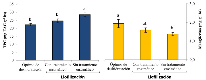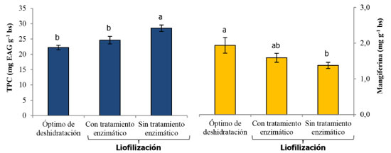 Con la finalidad de identificar los términos que tienen efecto sobre las variables de respuesta (TPC y mangiferina), se utilizó un análisis de varianza (Tabla 1S, Material Suplementario). En este sentido, se observó que la temperatura (X1) y la relación carga/área (X2), así como, ambos términos cuadráticos (X12 y X22) ejercieron efecto significativo sobre el TPC y concentración de mangiferina. Además, la falta de ajuste no fue significativa (p > 0,05), lo que indica que el diseño propuesto es adecuado para describir los datos experimentales. Por otra parte, los coeficientes de determinación señalaron que el 88.2% y 91.2% de las variaciones totales producidas en la experimentación, pueden ser explicados por las Ecuaciones 1 y 2 para el TPC y mangiferina, respectivamente: ![]() En base al modelo generado las condiciones óptimas de extracción fueron 54 °C y carga/área de 2.3 kg m-2, con respuestas predichas de 22.1 mg GAE g-1 bs y 1.84 mg g-1 bs, para el TPC y mangiferina, respectivamente. Además, para comprobar la validez del modelo matemático, se ensayó la deshidratación de la piel con las condiciones óptimas, con las cuales se obtuvo un TPC de 21.7 ± 1.6 mg EAG g-1 bs y 1.94 ± 0.22 mg g-1 bs de mangiferina. En definitiva, no existió diferencia estadística entre los valores predichos y experimentales, lo que confirma la validez de los modelos encontrados. Ahora bien, sabiendo que los compuestos fenólicos son termolábiles,26 se comparó el efecto de la deshidratación con aire caliente (condiciones óptimas) con el proceso de liofilización (muestras con y sin tratamiento enzimático) sobre el TPC y concentración de mangiferina de la piel de mango. La liofilización combina el uso de bajas temperatura y presión, lo que permite conservar y retener atributos sensoriales y nutricionales de los alimentos.27 Características que hacen que este procedimiento sea ampliamente utilizado frente a la deshidratación con aire caliente, debido a que este último usualmente provoca pérdida de nutrientes.28 Como se puede observar en la Figura 2, la deshidratación con aire caliente bajo las condiciones óptimas permite obtener valores estadísticamente similares a los observados con la muestra liofilizada con tratamiento enzimático, convirtiendo a la deshidratación con aire caliente en una opción rentable para el aprovechamiento de este subproducto debido a su bajo costo de equipamiento y operación.29 Por otro lado, se observa que el tratamiento enzimático aplicado a la muestra en etapas previas para inactivar enzimas presentes, produce un descenso notorio en el TPC, posiblemente debido a la solubilización inducida de los compuestos durante este proceso.30 En contra parte, para mangiferina no se evidenció esta reducción, esto debido a que la mangiferina es escasamente soluble en agua.31