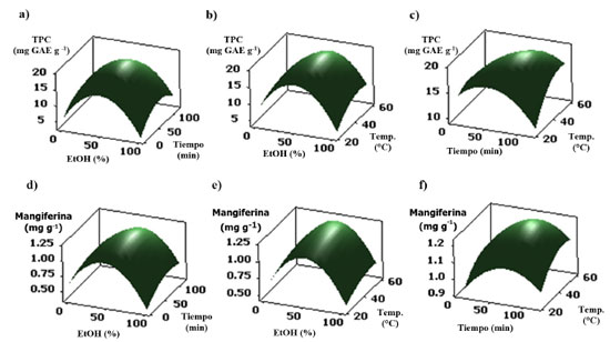 ![]() Figura 3. Grafica 3D para la optimización del proceso de extracción: a) efecto de la concentración de etanol y tiempo de extracción sobre el TPC, b) efecto de la concentración de etanol y temperatura de extracción sobre el TPC, c) efecto del tiempo y temperatura de extracción sobre el TPC, d) efecto de la concentración de etanol y tiempo de extracción sobre el contenido de mangiferina, e) efecto de la concentración de etanol y temperatura de extracción sobre el contenido de mangiferina, f) efecto del tiempo y temperatura de extracción sobre el contenido de mangiferina