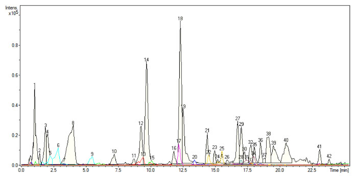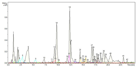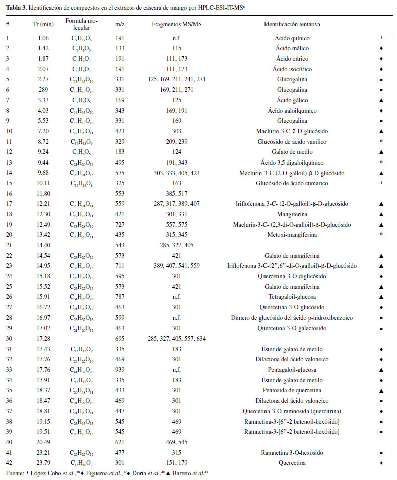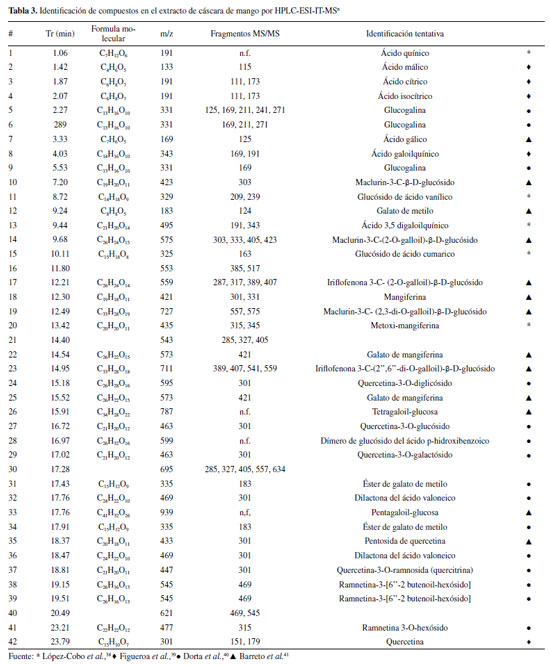 Con relación a las variables concentración de etanol y la temperatura de extracción, se puede apreciar que la cantidad de ambas variables respuesta alcanzaron un máximo cuando el solvente utilizado contiene un 55% EtOH y la temperatura es aproximadamente 55 °C. Al igual que en el caso anterior, es evidente una disminución en las variables, siendo está más marcada para la variable concentración de etanol (Figuras 3 b y e). Este resultado es similar al encontrado en piel de uva por Ghafoor y Choi,34 quienes observaron un contenido fenólico máximo a 55 °C y 50% EtOH. Finalmente, las Figuras 3 c y f reflejan el efecto del tiempo y la temperatura de extracción, sobre la concentración de fenoles totales y mangiferina. Un incremento en las variables respuesta se alcanza hasta un tiempo de 80 min y temperatura de extracción de 55 °C. Una vez superados estos límites se produce un descenso en las variables estudiadas. Esta relación también se observó en la determinación de las condiciones óptimas para la extracción de compuestos fenólicos presentes en las hojas de mora.35 Las condiciones que permitieron maximizar el contenido fenólico y mangiferina extraídos de la piel de mango fueron 50% EtOH, 71 min y 51 °C (Tabla 2). Bajo estos parámetros, se obtuvo un contenido fenólico de 19.5 ± 0.8 mg EAG g-1 bs y una concentración de mangiferina de 1.50 ± 0.13 mg g-1 bs. Los resultados obtenidos experimentalmente no difieren (p < 0.05) con los valores predichos por el modelo (19.37 mg EAG g-1 bs y 1.22 mg g-1 bs), confirmando que el modelo utilizado fue adecuado para predecir el TPC y concentración de mangiferina. Con la finalidad de determinar la efectividad de la UAE, se realizó la extracción de los compuestos fenólicos con una técnica convencional (maceración sólido-líquido) desarrollado por Pérez-Jiménez y Saura-Calixto,36 método que permite extraer la mayor cantidad de compuestos antioxidantes de matrices vegetales. Sin embargo, con la limitante de utilizar solventes incompatibles con la industria alimentaria como son el metanol y la acetona. En este sentido, con el método tradicional y UAE para el TPC se encontraron los resultados de 22.1 ± 0.7 y 19.5 ± 0.8 mg GAE g-1 bs, respectivamente. De igual manera, para mangiferina se encontró valores de 1.94 ± 0.22 y 1.50 ± 0.03 mg g-1 bs para los métodos tradicionales y UAE, respectivamente. La ligera diferencia encontrada, se debe al potencial de la UAE, debido principalmente a la cavitación generada cuando una onda ultrasónica se propaga a través de un medio, causando ruptura celular y un aumento en la transferencia de masa.37 Lo que le confiere a esta técnica obtener un extracto rico en compuestos fenólicos empleando únicamente solventes GRAS. Además, se observó una reducción en el tiempo de extracción cuando se utilizó ultrasonido (71 min), comparado con el tiempo utilizado en la maceración (120 min). Esto demuestra que la UAE es eficiente a la hora de extraer compuestos fenólicos presentes en la piel de mango y permite obtener excelentes resultados en tiempos cortos de extracción. Identificación de compuestos fenólicos en piel de mango La técnica analítica HPLC-ESI-IT-MSn se utilizó para identificar los compuestos presentes en el extracto obtenido bajo las condiciones óptimas. En este sentido, un total de 38 compuestos se identificaron tentativamente en la piel de mango (Figura 4). Los tiempos de retención, fórmula molecular, m/z experimental, espectros de masas, rutas de fragmentación y la información reportada en la literatura, fueron indispensables para la identificación de compuestos, esta información se detalla en la Tabla 3. Los compuestos detectados permanecen a diversas familias como: ácidos orgánicos, ácidos fenólicos, galatos y galatoninos, flavonoides, xantonas y derivados de la benzofenona.
