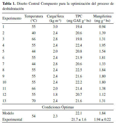 PARTE EXPERIMENTAL Reactivos Para la extracción de compuestos fenólicos se utilizó etanol, acetona y ácido clorhídrico suministrados por Merck KGaA (Darmstadt, Alemania) y metanol proveniente de Pareack Applichem (Barcelona, España). Los reactivos utilizados en la cuantificación de fenoles totales: reactivo Folin Ciocalteu, ácido gálico y carbonato de sodio fueron obtenidos de Merck KGaA (Darmstadt, Alemania). Por otra parte, para la identificación del perfil fenólico y optimización de mangiferina por HPLC se utilizó acetonitrilo (ACN) grado HPLC procedente de Merck KGaA (Darmstadt, Alemania) y ácido acético obtenido de J.T. Baker Analyzed. Se utilizó el estándar de mangiferina suministrado por Sigma-Aldrich (Misuri, USA). Muestras En la presente investigación se trabajó con mango (Mangifera indica L. cv. "Tommy Atkins"), adquirido en un local comercial del catón Catamayo, provincia de Loja, Ecuador. La muestra se lavó y luego se sometió a un proceso de escaldado a 75 °C por 8 min con el fin de reducir la actividad enzimática.13 Posteriormente, se separó mecánicamente la piel del resto de la fruta e inmediatamente fueron deshidratadas. El estado de madurez de la fruta fue evaluado mediante el análisis de sólidos solubles y acidez titulable según los métodos AOAC 932.12 y AOAC 942.15, respectivamente. El contenido de humedad se determinó siguiendo el protocolo descrito en el método AOAC 934.06.14 Optimización del proceso de deshidratación Se optimizó el proceso de deshidratación utilizando metodología de superficie de respuesta (MSR). Para ello, se empleó un diseño central compuesto (DCC), debido a que permite comprender las interacciones entre los parámetros que se van a optimizar.15 Las variables seleccionadas fueron: temperatura (40-70 °C) y relación carga/área (1,80-3 kg m-2), mientras que el contenido de fenoles totales y mangiferina fueron las variables de respuesta seleccionadas. Los diferentes experimentos se llevaron a cabo de forma aleatoria, para minimizar los efectos de la variabilidad en las respuestas observadas. La deshidratación de la piel de mango se realizó hasta obtener un contenido de humedad menor al 10% y una actividad de agua entre 0.3 y 0.4. Esta operación se llevó a cabo en un deshidratador tipo bandejas con circulación de aire caliente (DY-110H, Lassele, Korea). Las condiciones ensayadas se detallan en la Tabla 1. Además, como control del proceso, se deshidrató la piel de mango en un liofilizador (7754047, Labconco, USA). Posteriormente, las muestras deshidratadas se trituraron en un molino ultracentrífugo hasta un tamaño de partícula < 500 μm (ZM 200, RTSCH, Alemania), dimensión que facilita la extracción de los compuestos fenólicos.16