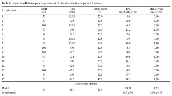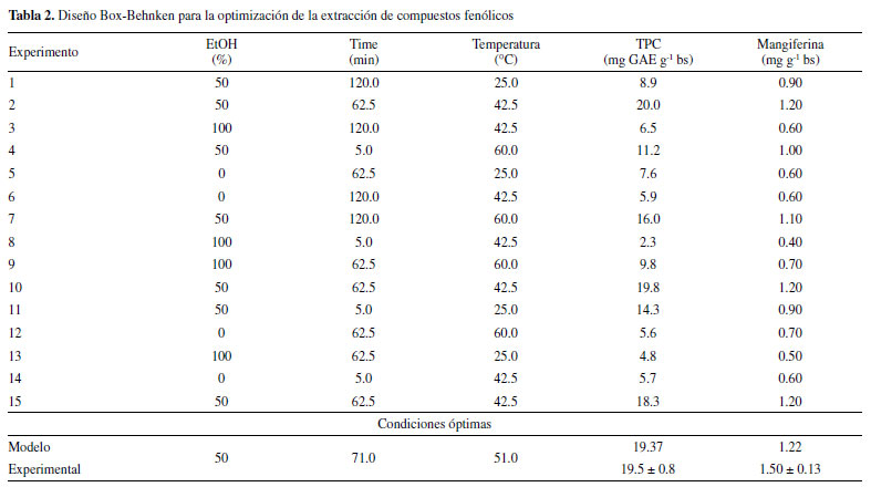 La extracción de compuestos fenólicos se realizó de acuerdo al protocolo descrito por Pérez-Jiménez y Saura-Calixto.17 Brevemente, se pesó 1g de muestra en un tubo de centrífuga y se adicionó 20 mL de una disolución metanol-agua (50:50 v/v, pH 2 acidificados con HCl). Se extrajo durante 1 hora a 200 rpm empleando un agitador horizontal (3018, GFL) y luego se realizó la separación de fases utilizando la centrifuga (Sorvall ST8, ThermoFisher Scientific, USA) a 8700 rpm por 30 min. Posteriormente, se recuperó el sobrenadante y, al residuo se le agregó 20 mL de acetona: agua (70:30 v/v), al cual nuevamente se lo agitó y se centrifugó hasta obtener un nuevo sobrenadante. Finalmente, los sobrenadantes se combinaron y almacenaron a -20 °C hasta su posterior análisis. Optimización del proceso de extracción Una vez optimizado la operación de deshidratación, se optimizó el proceso de extracción de compuestos fenólicos de piel de mango. Como técnica de extracción se seleccionó la extracción asistida por ultrasonidos. Las variables independientes estudiadas fueron, temperatura de extracción (25-60 °C), relación etanol-agua (0-100%) y el tiempo de extracción (5-120 min). Las variables dependientes seleccionadas fueron el contenido de fenoles totales y mangiferina. Se utilizó el diseño Box-Behnken (DBB), metodología que permite una optimización rápida, económica y eficiente cuando se desea estudiar los efectos de tres o más variables.18 Las extracciones se llevaron a cabo en un baño de ultrasonidos (FS30D, Fisher Scientific, USA) con una frecuencia de 42 kHz y a 100 W de potencia. En un tubo de centrífuga se pesó 1 g de muestra y se agregó 20 mL del solvente de acuerdo con las concentraciones indicadas en la Tabla 2. Posteriormente, las muestras se extrajeron con las diferentes temperaturas y tiempos indicados por el DBB e inmediatamente después se centrifugaron a 8700 rpm durante 30 min. Tras la centrifugación, los sobrenadantes se recogieron para la determinación de fenoles totales y mangiferina.