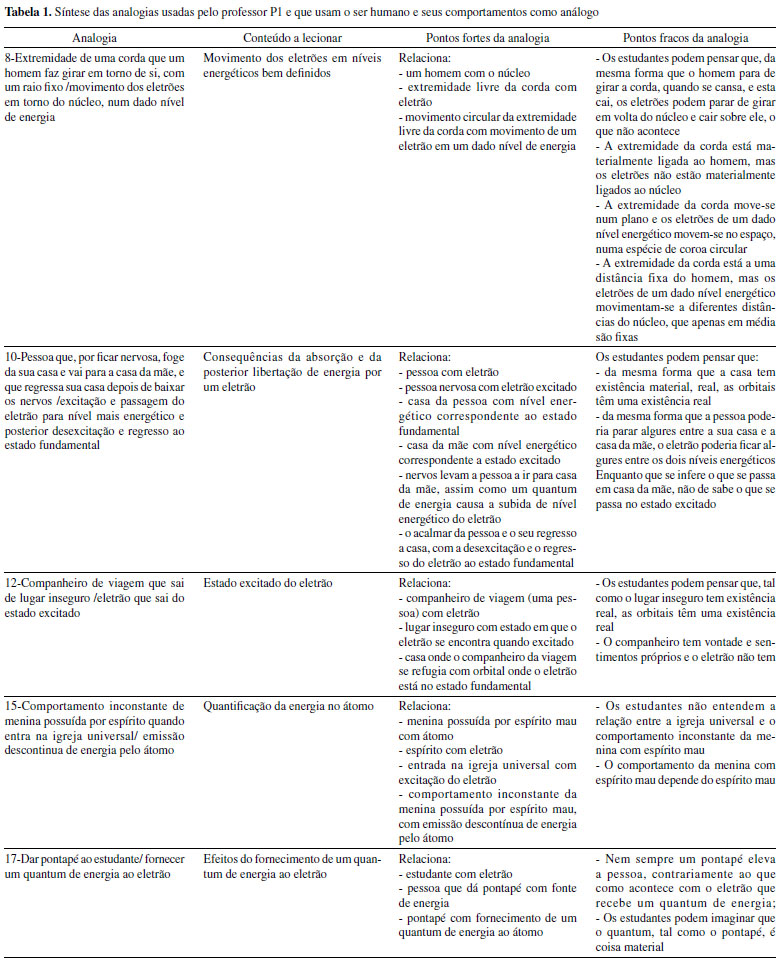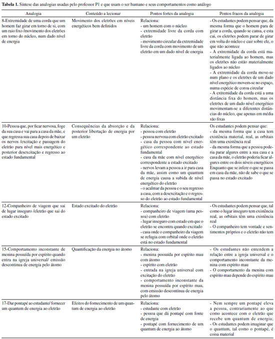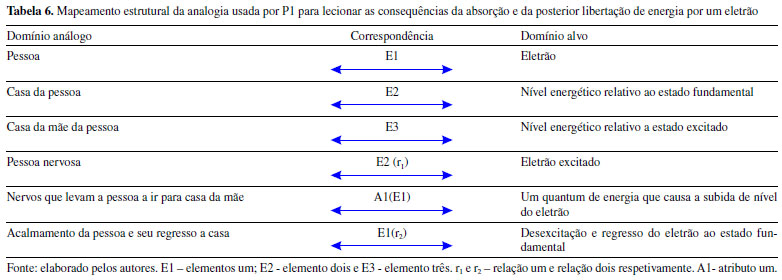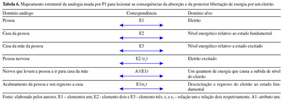 A fim de ilustrar o mapeamento efetuado, transcreve-se a apresentação, verbal, da analogia 10, tal como foi apresentada pelo professor P1 em uma das aulas observadas: "Imagina quando um individuo fica zangado você continua ainda definitivamente zangado? O que se sucede depois de algum tempo. Depois de algum tempo você volta ao estado natural, você respira fundo de alívio. Assim também acontece quando o eletrão sai do estado fundamental ao estado excitado com absorção de quantum de energia e volta ao seu estado fundamental com emissão de quantum de energia que havia absorvido. Quer dizer que a senhora ficou nervosa, ficou excitada saiu e foi a casa da mãe e depois de baixar os nervos ela voltou a sua casa o que corresponde a emissão de quantum de energia e regresso ao estado fundamental onde a energia é baixa." (P1) O mapeamento dessa analogia (Tabela 6) evidencia as correspondências entre elementos do domínio alvo e do domínio análogo (E1, E2 e E3), a correspondência entre mudanças de comportamento desses elementos [E2 (r1) e E1(r2)] e as relações entre relações no domínio alvo e relações no domínio análogo [A1(E1)]. Esses aspetos são importantes quando se usa analogias que são complexas e que, como decorre do que foi escrito na primeira parte do texto, precisam de ser bem explicitadas para poderem ser devidamente entendidas. O mapeamento das analogias permite, também, obter informação sobre a consitência interna das analogias, na medida em que obriga a explicitar os elementos que constituem cada analogia e as relações que entre eles se estabelecem, facilitando a análise da validade científica e pedagógica das relações estabelecidas entre o(s) elemento(s) considerado(s) alvo(s) e o(s)considerado(s) análogo(s). Os pontos fracos que emergiram do mapeamento das analogias são evidências da respetiva inconsistência interna.
