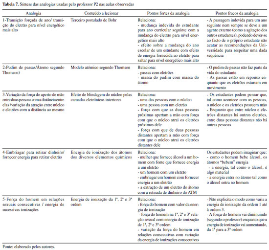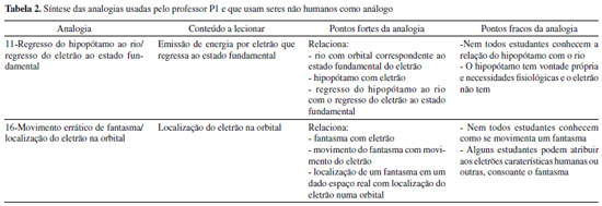 A análise das analogias apresentada na Tabela 7 resultou do mapeamento estrutural das diversas analogias utilizadas por P2, nas suas aulas. A fim de ilustrar esse mapeamento, transcreve-se a apresentação, verbal, da analogia 1 pelo professor P2: