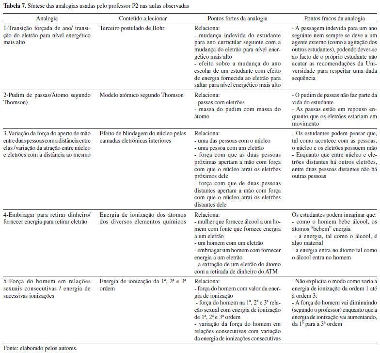 A análise apresentada nas Tabelas 1 and 5 mostra que a maior parte das analogias usadas pelo professor P1 têm potencialidades e limitações, o que é concordante com resultados obtidos por outros autores.11,21,34 Contudo, esse tipo de análise não parece ter sido, nem mesmo implicitamente, efetuado pelo professor antes de usar as analogias nas suas aulas. Na verdade, embora tenha tentado apresentar algumas descrições para facilitar a compreensão das analogias (por exemplo, na analogia 10, descreveu o que sucede com o eletrão excitado e depois da desexcitação, relacionando-o com o comportamento da pessoa nervosa e depois de estar calma), tal como aconteceu no estudo realizado por Kim et al.,21 P1 não considerou pertinente ou não conseguiu apresentar as potencialidades e as limitações das analogias usadas. Essa omissão pode levar os estudantes a estabelecer relações concetuais pouco apropriadas com o conceito em causa e, até, a construir ideias erradas sobre os conceitos que P1 queria ensinar. Na verdade, mais de um terço das analogias usadas por esse professor envolviam comparações do átomo e de partículas subatómicas com o ser humano e seus comportamentos (ex.: as analogias 8, 10, 12, 15 e 17) ou com animais ou seres imaginários (ex.: a analogia 11 e a analogia 16) ou com corpos celestes e seus movimentos (ex.: as analogias 4, 13 e 14), com alimentos, como frutas e suas caraterísticas (ex.: as analogia 1) ou pudim de passas (ex.: analogia 3) e com objetos de natureza diversa (ex.: as analogias 2, 5, 6, 7 e 9). Como foi referido anteriormente e como Akaygun, et al.22 reconhecem, esse tipo de comparações pode ser problemático, pois os estudantes podem fazer uma transferência indevida de caraterísticas e comportamentos do ser humano, de animais ou dos corpos celestes para o átomo e para as partículas subatómicas. Note-se que as analogias apresentadas por P1 eram analogias verbais, não tendo o professor recorrido, em nenhum caso, a elementos visuais (imagens) ou gráficos (esquemas), os quais, como referem Dourado et al.; Vasconcelos e Arroio35,36 podem ajudar os alunos a fazer a transição do domínio macroscópico (do dia a dia) para o sub-microscópico (da Química). A Tabela 7 apresenta as analogias que foram usadas pelo professor P2 nas aulas observadas e a respetiva análise resultante de um mapeamento semelhante ao explicitado na Tabela 2.