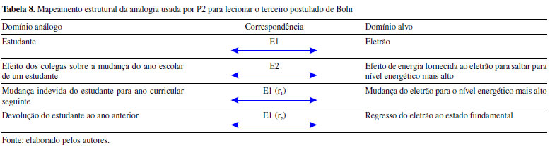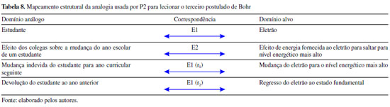 Na Tabela 8 apresenta-se o mapeamento desta analogia, o qual evidencia as correspondências entre elementos do domínio alvo e do domínio análogo (E1 e E2) e a correspondência entre mudanças de comportamento desses elementos (E1 (r1) e E1 (r2)), aspeto importante quando se usa analogias.